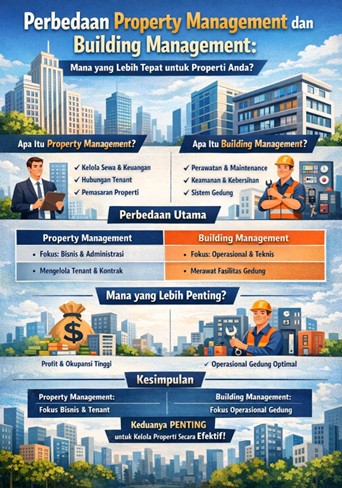 Mana yang Lebih Tepat untuk Properti Anda? Dalam industri properti, istilah property management dan building management sering dianggap sama. Padahal, keduanya memiliki fungsi, fokus, dan tanggung jawab yang berbeda. Memahami perbedaan property management dan building management sangat penting agar pengelolaan properti berjalan optimal dan sesuai kebutuhan. Apa Itu Property Management? Property management adalah pengelolaan aspek […]