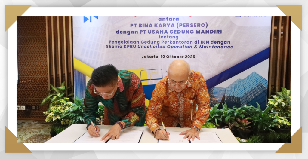 PT Bina Karya (Persero) bersama PT Usaha Gedung Mandiri secara resmi menandatangani Kesepakatan Kerja Sama strategis dalam pengelolaan gedung perkantoran di Ibu Kota Nusantara (IKN). Penandatanganan ini dilaksanakan pada 10 Oktober 2025 di Wisma Mandiri 1, Jakarta, dan menjadi momentum penting bagi kedua perusahaan dalam memperkuat sinergi sektor infrastruktur dan pengelolaan properti nasional.